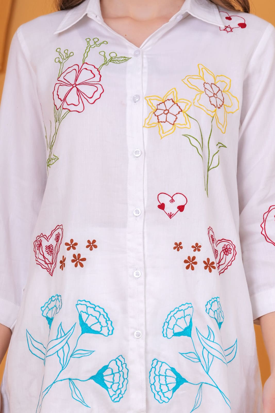 The shirt is adorned with abstract floral and shape embroidery in colorful threads, giving it a vibrant, artsy appeal. With its relaxed silhouette, button-down front, and three-quarter sleeves, it ensures effortless style and comfort.