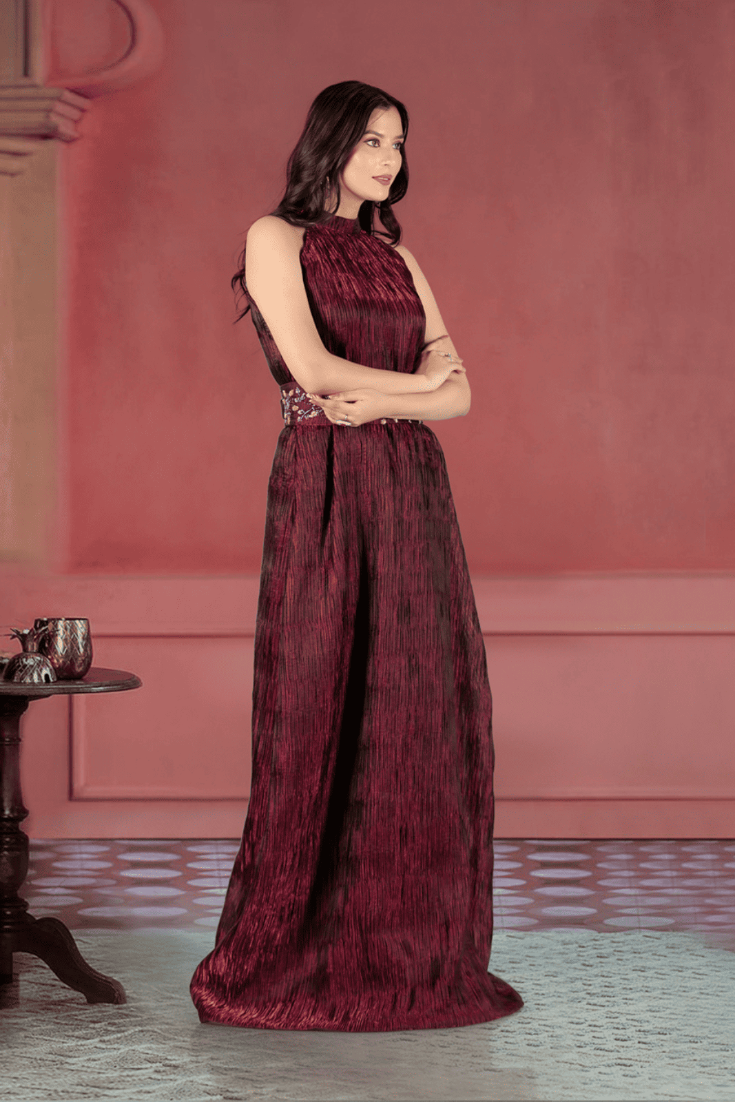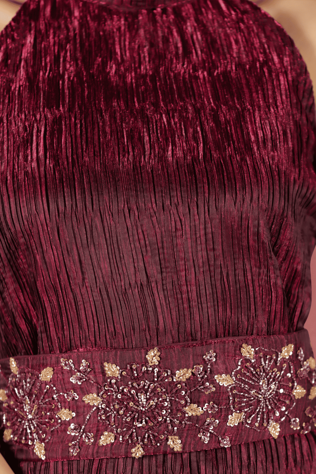 | Design Details | Halter neckline for a sleek and elegant look A-line floor-length silhouette for effortless grace Crushed organza belt with embroidered cutdana, sequins, and beads for intricate detailing |